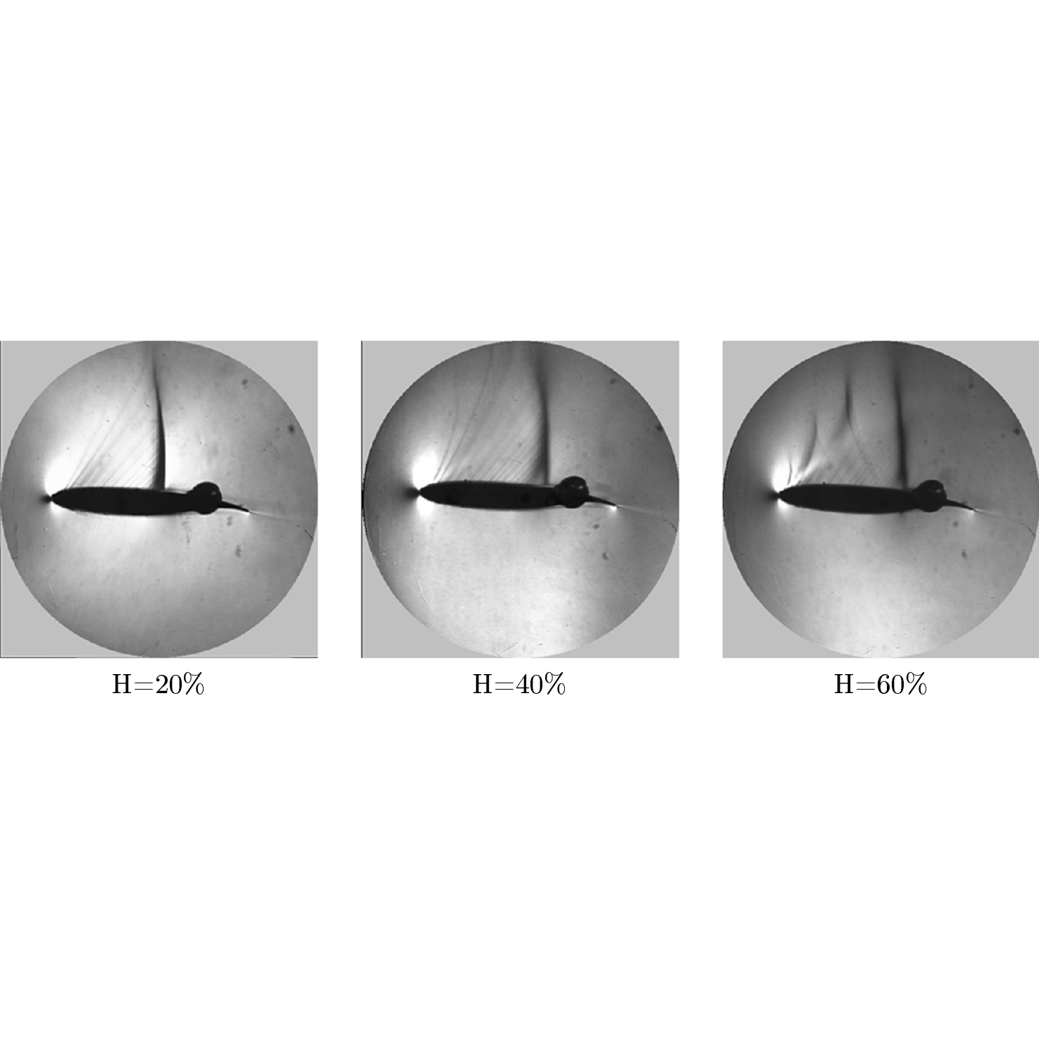 A series of Schlieren photographs showing the flow around the SC(2)-0714 airfoil for three different air humidity values, angle of attack = 3, Ma