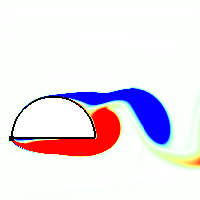 The result of computational modeling. Vortex path after semicircular bodyat Reynolds number