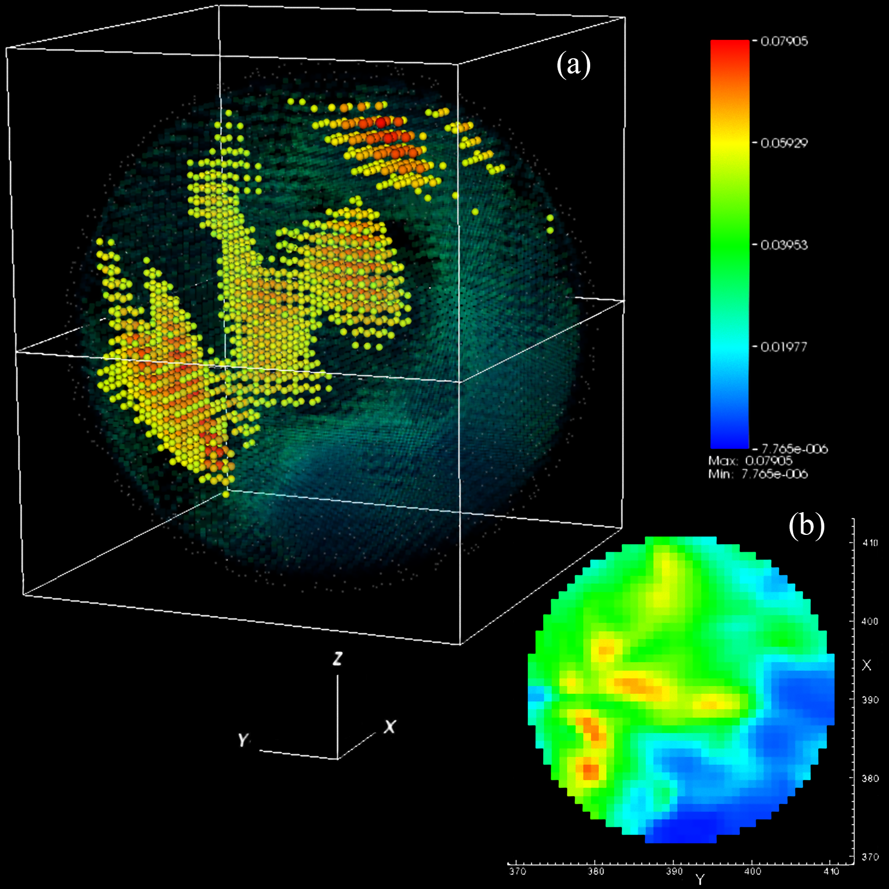 Network built from the JHTDB (http://turbulence.pha.jhu.edu) considering a sphere of radius \(\lambda \), centered in the node C(391,391,512). (a) Degree centrality on a 3D view; (b) Degree centrality on a section normal to Z-axis and passing through C