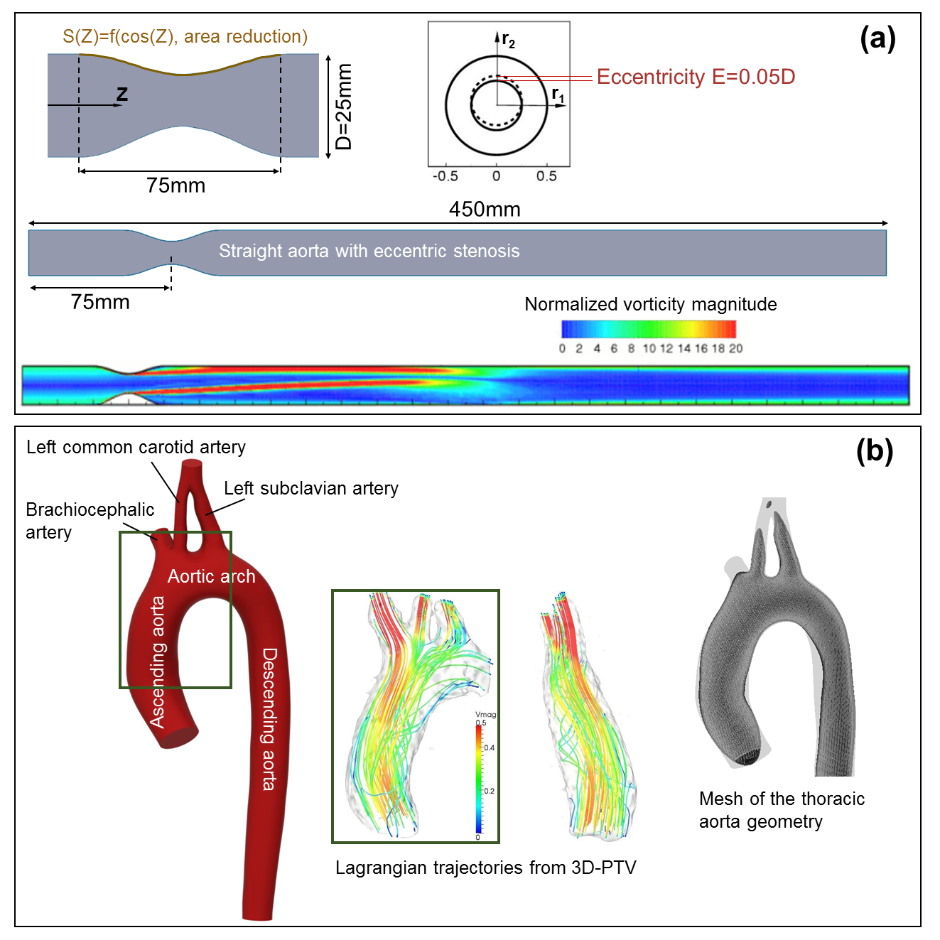 DNS in (a) a straight stenosed aorta and the numerical validation data (Varghese S. S. et al. (2007), J. Fluid Mech., 582, 253-280) (b) an anatomically accurate aorta and the 3D-PTV comparison data (Gallo D. et al. (2014), J. Biomech., 47,