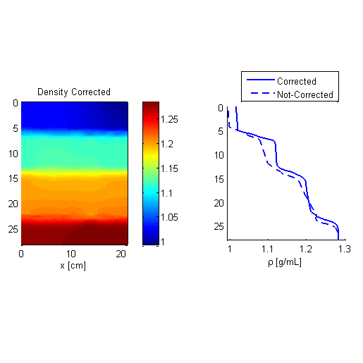 (Left) Reconstruction of the density field of a four layers saline solution. (Right) density profile (z) of the previous stratified setup. Solide line - correct solution using the new method,dashed line - the Poisson solution without