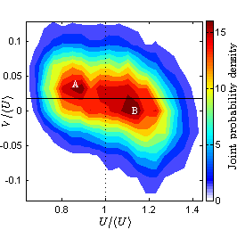 Joint probability density function of streamwise (U) and wall normal (V) velocities in marginally turbulent flow. A and B are the two flow