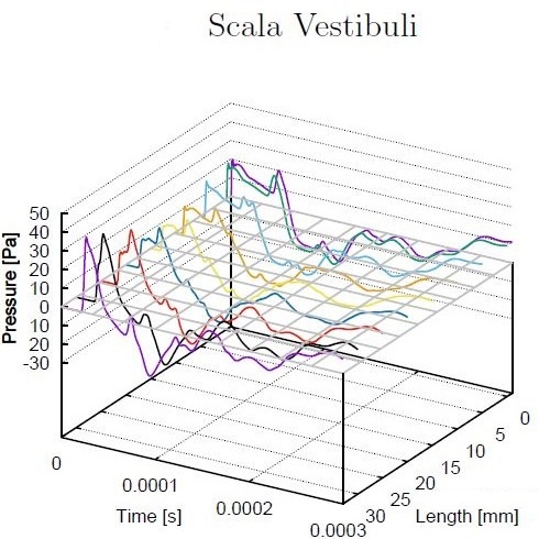 Pressure distribution in the scala vestibuli of the cochlea measured on points placed along the basilar membrane. Length on the charts is measured in reference to the basilar membrane
