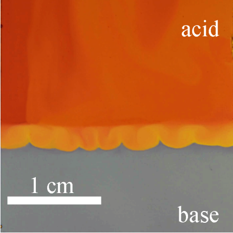 In the paper the results of the experimental investigation of convective instabilities driven by an acid-base neutralization reaction are reported. Experiments were performed in a Hele-shaw cell. Aqueous solutions of nitric acid and alkali metal hydroxides (Li, Na, K) were used as reactants. Depending on the initial reactants concentration, two reaction modes are observed. The first one is a diffusion mode, where the predominant mass transfer mechanism is diffusion, leading to slow rates of reaction and the second one is convective regime characterizing by the formation of the intense convective motion and rapid reaction. Moreover a new type of instability was found (Fig.1). Physical model of the observed phenomenon and maps of regimes for various pairs ”acid - base” have been proposed.